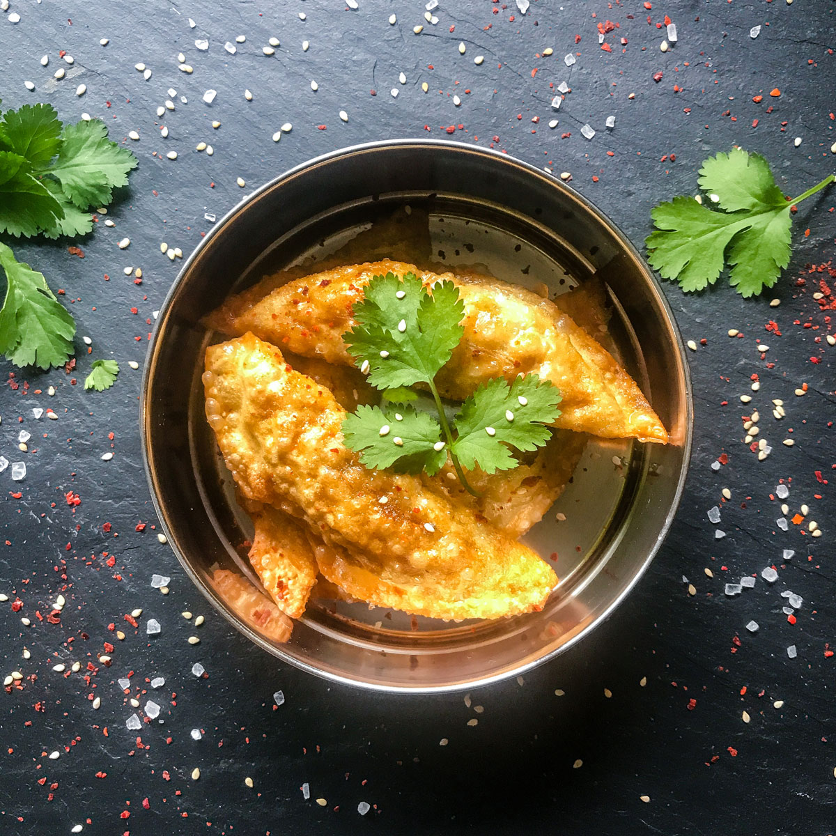 Tasty little dumplings, fried, not boiled for extra deliciousness. Made with fresh vegetables and a freshly ground, homemade Japanese inspired spice mix.